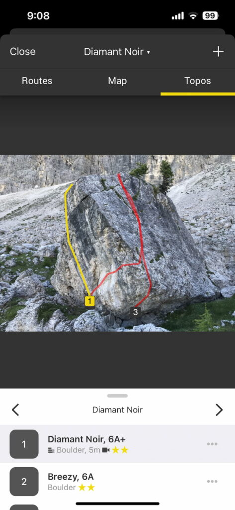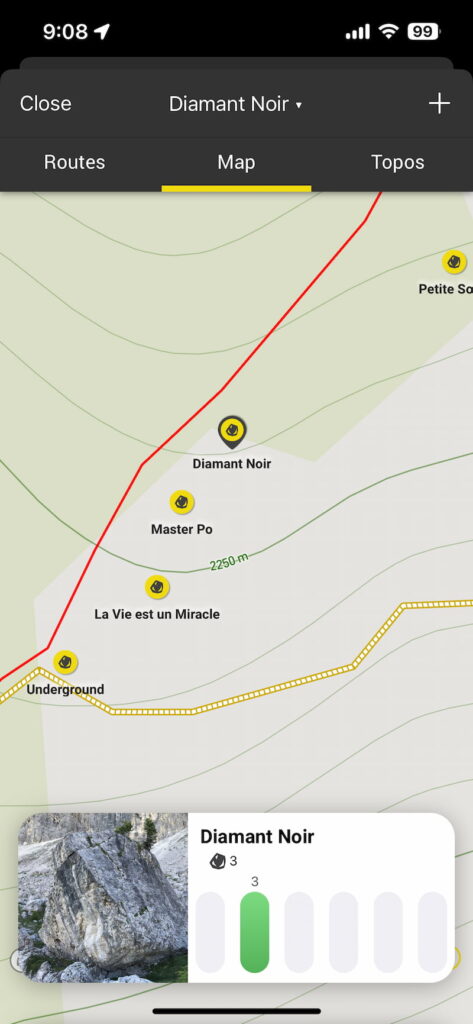 ヨーロッパでは掲載エリアが非常に充実しており、マップ機能も優秀。この後訪れるイタリアでのクライミングでも大活躍でした。
