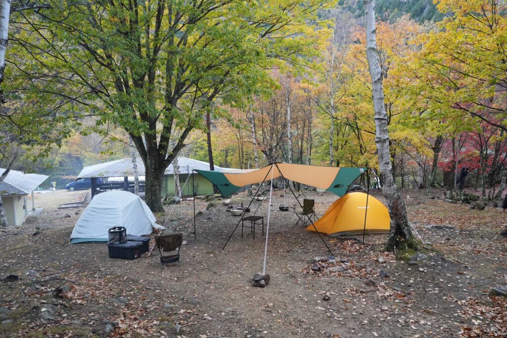 設営場所は紅葉に包まれた林の中。すでにキャンプと焚火が楽しみに。